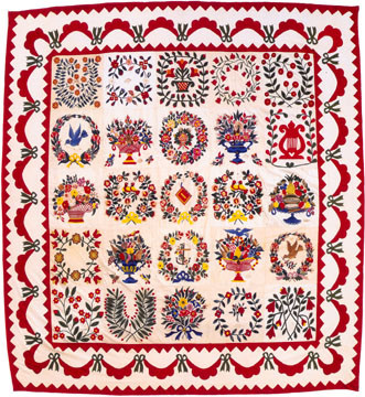 Quilts were treasured, well preserved, and exist to this day.This photograph is a typical BAQ dated 1851. Today authentic vintage Baltimore Album Quilts go for as much as $200,000 at auction. Yes, you read that right. In the late 20th century renowned quilter Elly Sienkiewicz almost single-handedly revived the interest in the Baltimore Album Quilt. Her 15 books on the BAQ and applique encourage even the newest quilter to give this traditional American craft a try. |