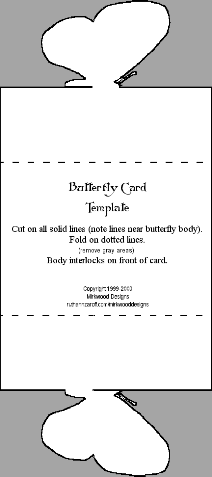 Butterfly Card CLICK HERE FOR THE PRINTABLE TEMPLATE. This template makes an interlocking butterfly card. Print out the template (link above) and trace onto card stock. The instructions are on the template itself. Remember to set your printer margins to half an inch so that the entire template prints out! |