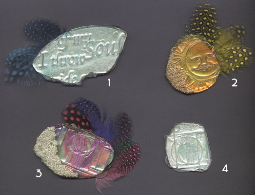 and for pins 1, 2, and 3, I adhered colorful feathers to the back with Yes! glue. Be
