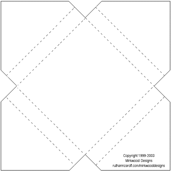 This template makes a shallow box whose four sides fold over, and the closure is a sticker. The finished box will hold something that is 3" x 3" and .5" thick -- perfect for a pad of 3" Post-It Notes or a small hand-made book! Remember that you can alter the template to suit your needs.