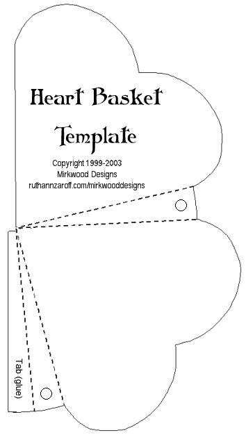 | Design idea: Cut the Heart Basket out of red card, fold and glue, and embellish with white doilies for an old-fashioned Valentine look. Punch holes where indicated, and tie a red ribbon as a handle. Fill with conversation hearts! |