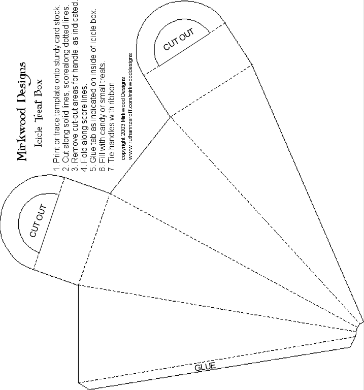 HERE FOR THE PRINTABLE TEMPLATE Note: Please make sure your printing margins are set to .5 inches (half an inch) or the template will not print completely. In your browser's Menu bar, select File > Page Setup, and change the margin settings to .5. (The selections may be slightly different between browsers.) This template makes a box shaped like an icicle, perfect to hang on your Christmas tree, or as a table decoration for each of your special holiday guests. It is based on a vintage Christmas box from the early 20th century. This box is perfect for holding candies or small treats! |