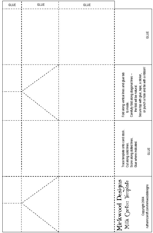 Milk Carton CLICK HERE FOR THE PRINTABLE TEMPLATE. Note: Please make sure your printing margins are set to .5 inches (half an inch) or the template will not print completely. In your browser's Menu bar, select File > Page Setup, and change the margin settings to .5. (The selections may be slightly different between browsers.) This template makes a box that looks like a milk carton. The finished box is about 2.25 x 2.25 x 4. Remember, though, that you can alter the template to suit your needs.