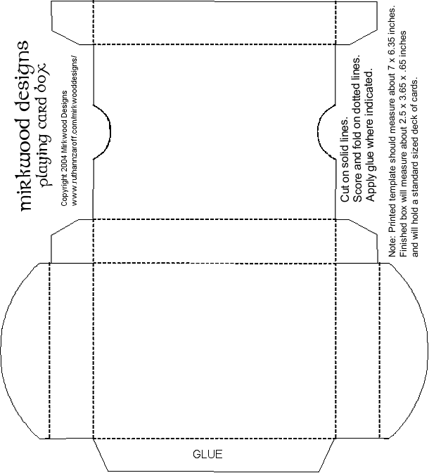 Playing Card Box CLICK HERE FOR THE PRINTABLE TEMPLATE. This template makes a box that will hold a deck of standard playing cards (about 2.5 x 3.65 x .65). Remember, though, that you can alter the template to suit your needs.