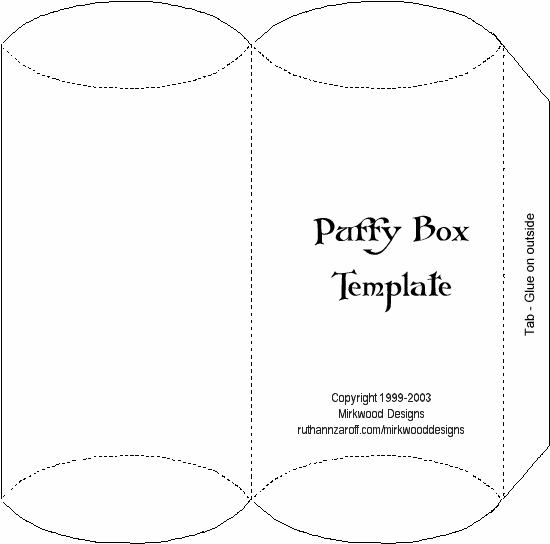 This box is a little tricky, and must be made using fairly stiff card stock. To score the curved lines, make a template out of cardboard or thick plastic, and lay the curved edge along the dotted scoring lines of your card stock. CLICK HERE for a PDF of the Puffy Box template without the printing on it, which you can print directly onto card stock.. |