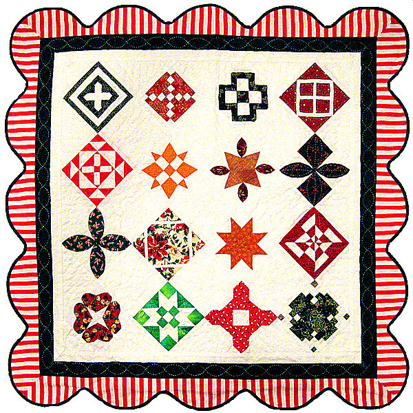 The quilt I designed required 16 blocks plus setting blocks, so I made an additional block. The dark border and binding are forest green, which is hard to tell from the photo. I quilted snowflakes in the setting blocks and various designs in each pieced block.