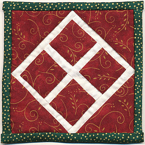 I received two of the same blocks in the same color combination, so I made a quilted coaster with the duplicate. J-2, Picture Perfect, was sewn by Martha L.
