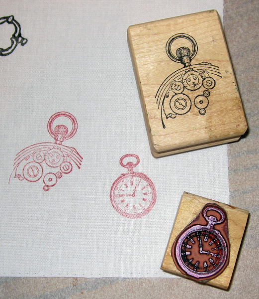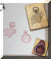 | You can also use commercial rubber stamps. At right is an example using stamps from my old stamp line. The red ink pad was a little dry, so the images are not as bright as they should be. |