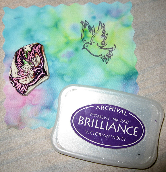 | I use a brush to apply ink to the surface of the stamp. Don't apply it too heavily or it will blob up on the fabric. Practice! |