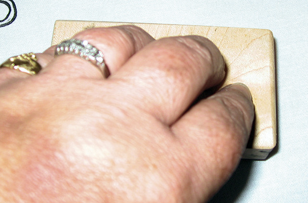 | Use steady, even pressure to stamp the fabric. In this case, I used white Kona cotton. |